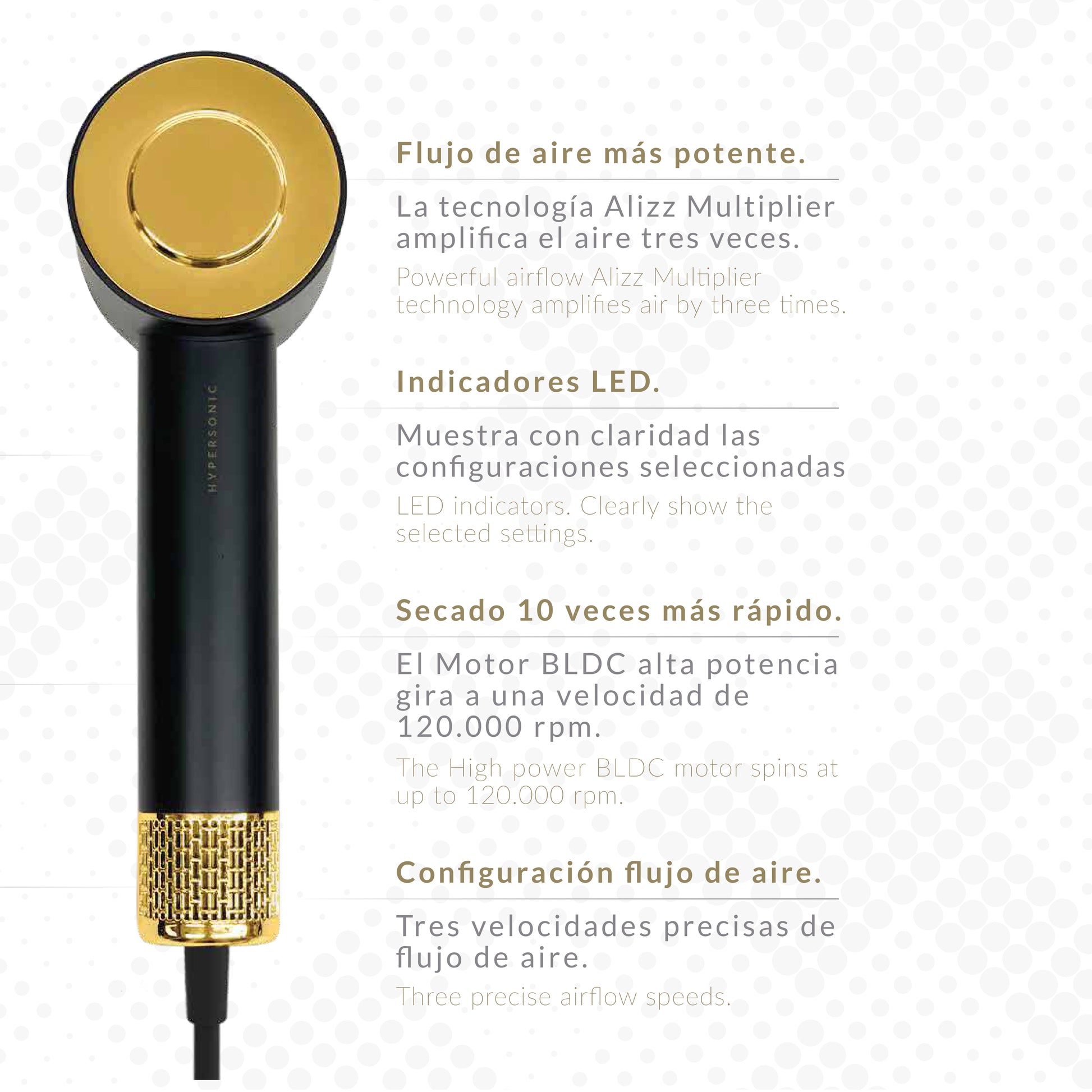 A diferencia de otros, el secador hipersónico alizz A+120.000 mide la temperatura del aire 40 veces por segundo y regula el calor. esto evita los daños producidos por el calor extremo y ayuda a proteger el brillo natural del cabello.